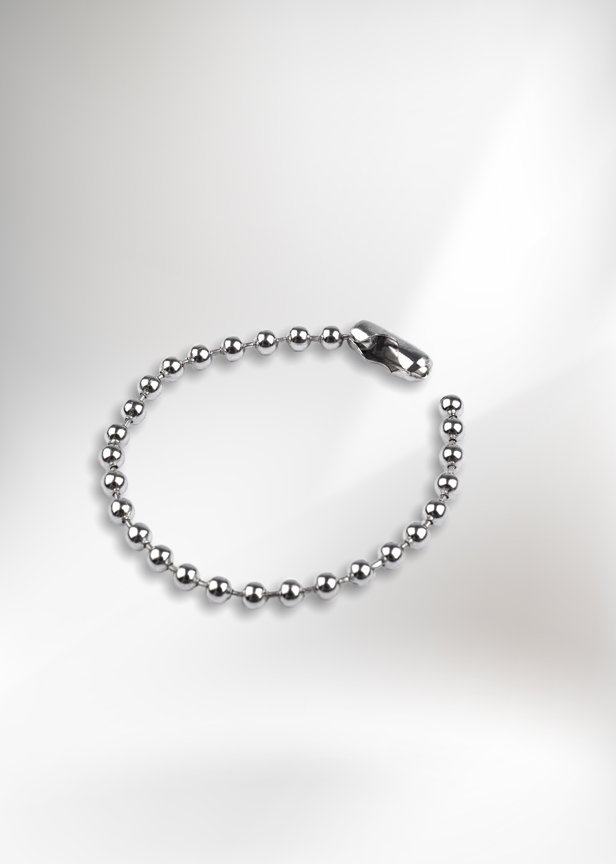 A nikkelezett acél golyós lánc hossza 10 cm, a golyók átmérője 2 mm, színe fényes fémes.